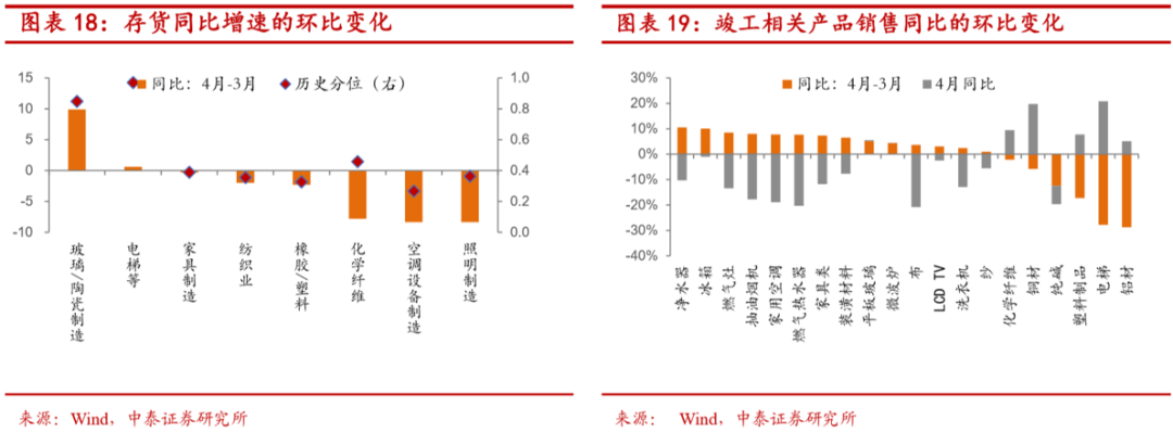 从存货数据看:与地产竣工的相关子行业多处于被动去库存的阶段。经历一季度存货的被动积压后,4月与地产竣工相关的多数行业产成品存货增速环比下滑,说明经济活动正在加快恢复。然而,从库存周期所处的位置看,这些行业被动去库存的意味更为明显,往前看是否能步入主动补库存还依赖地产竣工数据改善的持续性,较为欣慰的是除了电梯、玻璃/陶瓷制造等行业目前存货增速处于历史均值以上,其余多数行业存货压力相对较低,这也意味着未来竣工高峰将至时这些行业反弹空间更大。