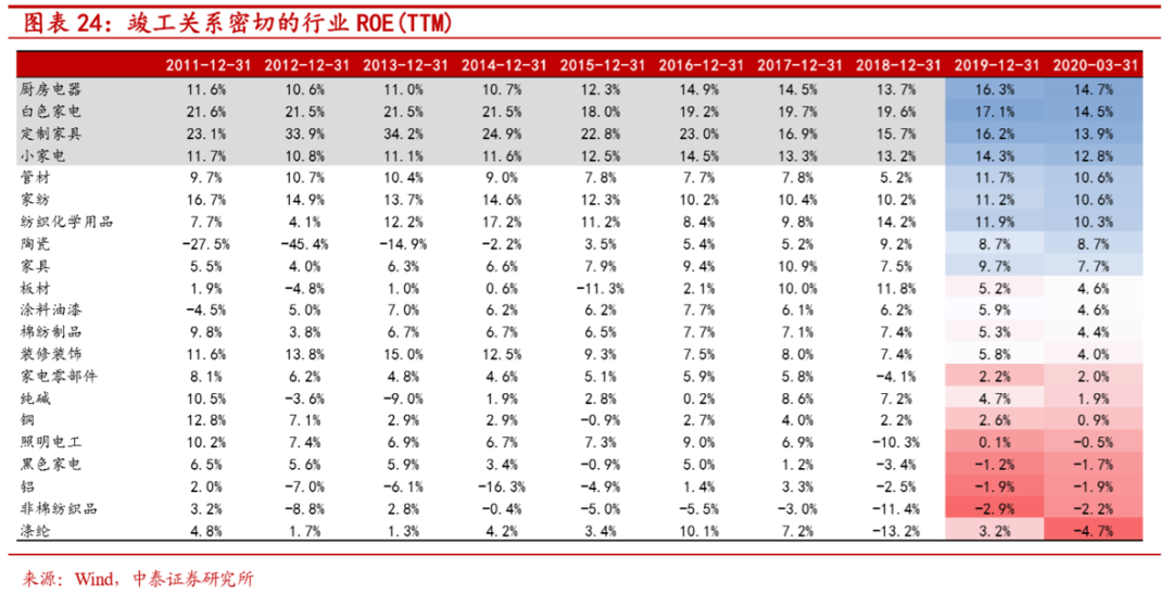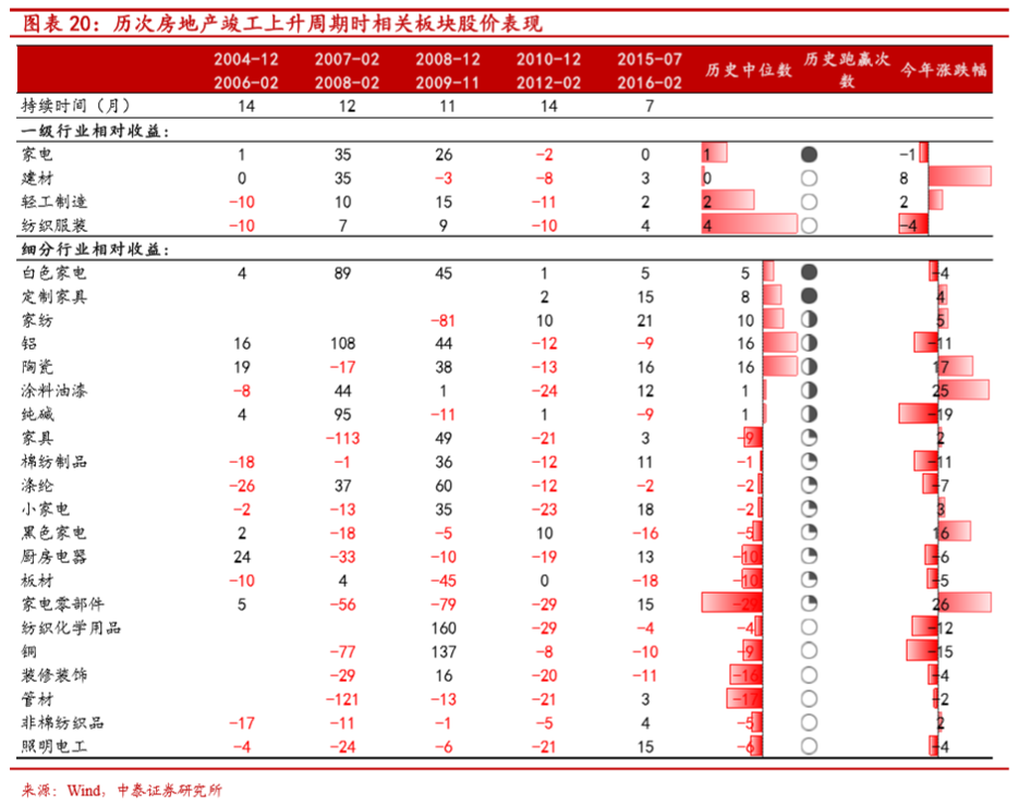 从历史上地产竣工周期回暖阶段相关板块的股价表现看,白色家电、定制家具、陶瓷、铝等行业往往表现较好。