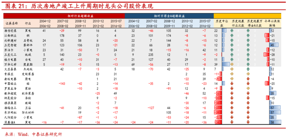 受益于良好的竞争格局,龙头公司的成长确定性更高,在对上述行业表现回顾后,我们进一步对主要子行业的龙头公司股价进行梳理。考虑到最近一次竣工上升周期发生在2015年下半年至2016年初,因此,结合历史的可追溯性,我们的样本剔除了2015年之后才上市的公司。
