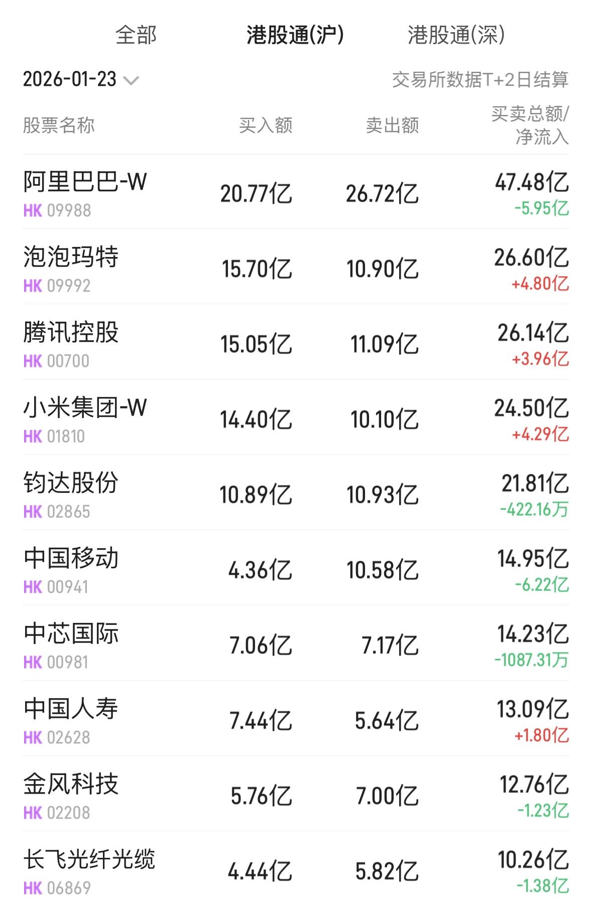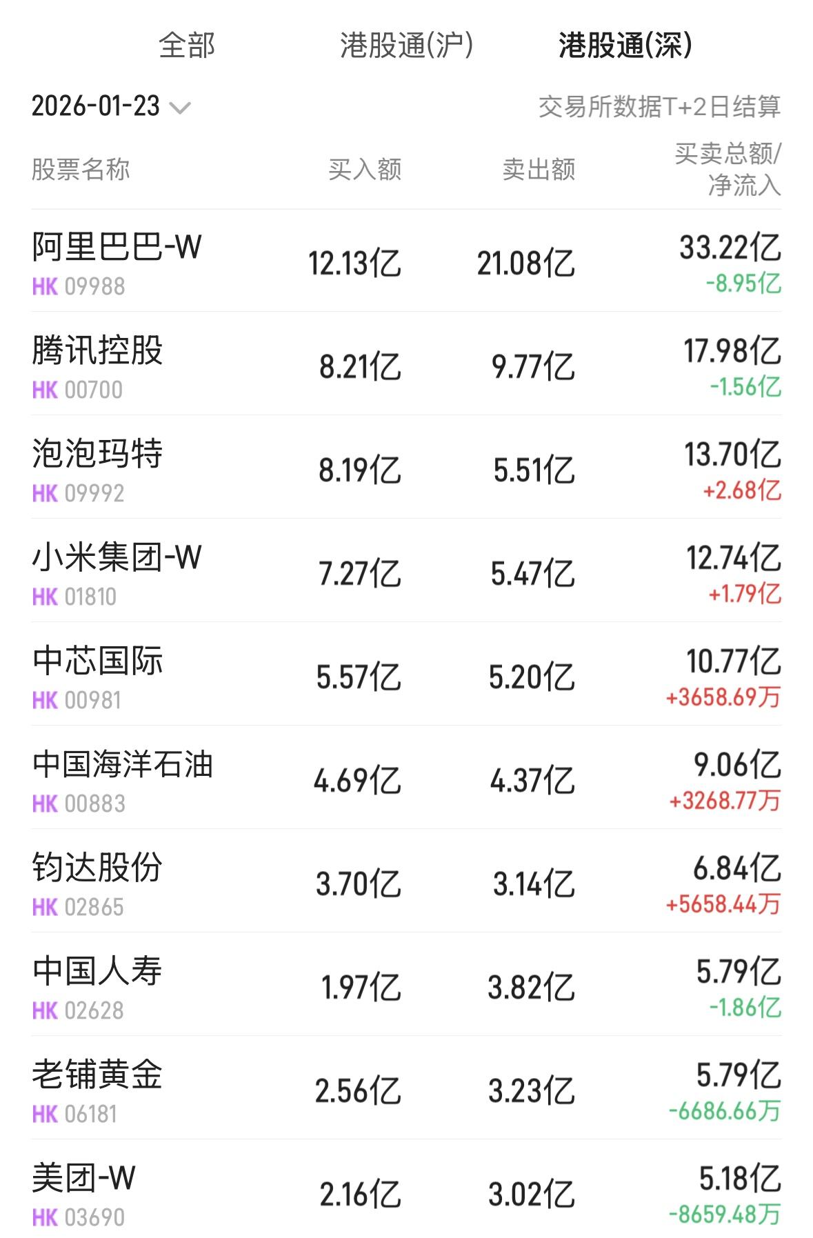1月23日港股市场,北水成交净卖出16.01亿港元,其中港股通(沪)成交净卖出5.6亿港元,港股通(深)成交净卖出10.41亿港元。