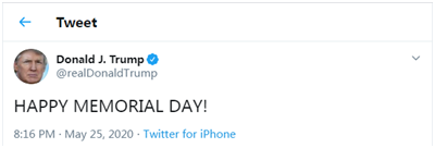 据环球时报报道,特朗普推特又被怼了,据报道,特朗普当地时间25日早上8时许用全大写英文字母发了“阵亡将士纪念日快乐”这样一条推特。