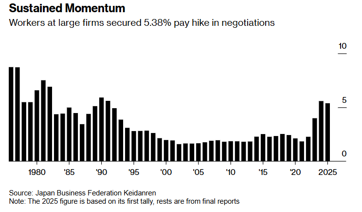 加薪势头持续——日本大企业的员工们在谈判中获得5.38%涨薪(注:2025 年数据为初步汇总,其余为最终报告)