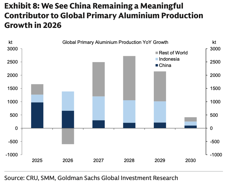高盛预计,2026年中国铝产量将增长67万吨,接近4500万吨年产能上限;海外方面,由中国主导的在安哥拉、越南、哈萨克斯坦和沙特的投资将推动新一波供应浪潮。