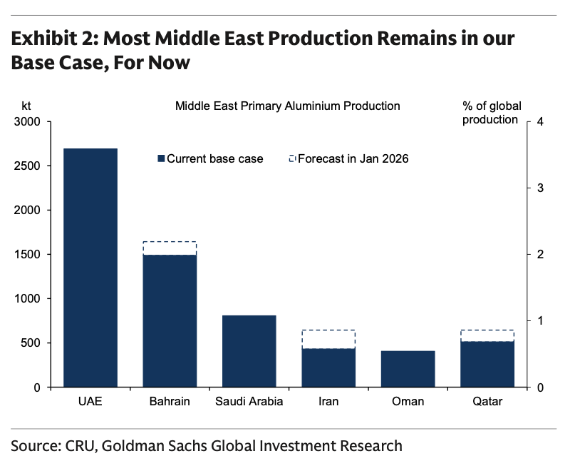 在新报告中,高盛并未改变对铝市场“全年供需大体平衡、价格中枢中期回落”的判断,但在中东冲突升级、实际产能受损的背景下,明显上修了短期风险溢价定价逻辑,即供给冲击在短期内将主导价格走势,铝价对产量损失的弹性显著提高,市场进入典型的事件驱动阶段。