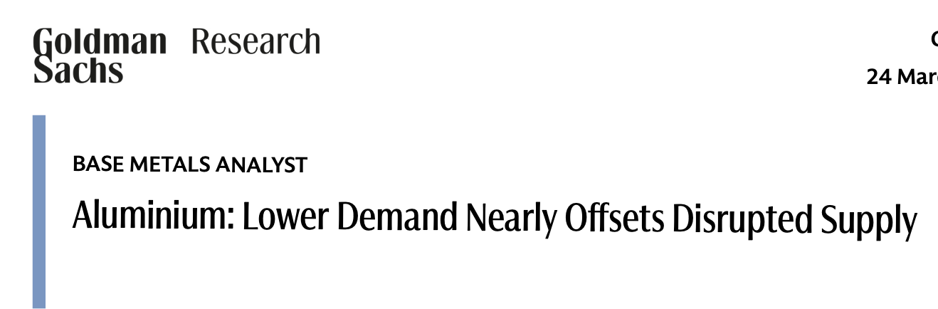 在3月24日的报告中,高盛着重强调了铝需求减弱对供应短缺的对冲影响。