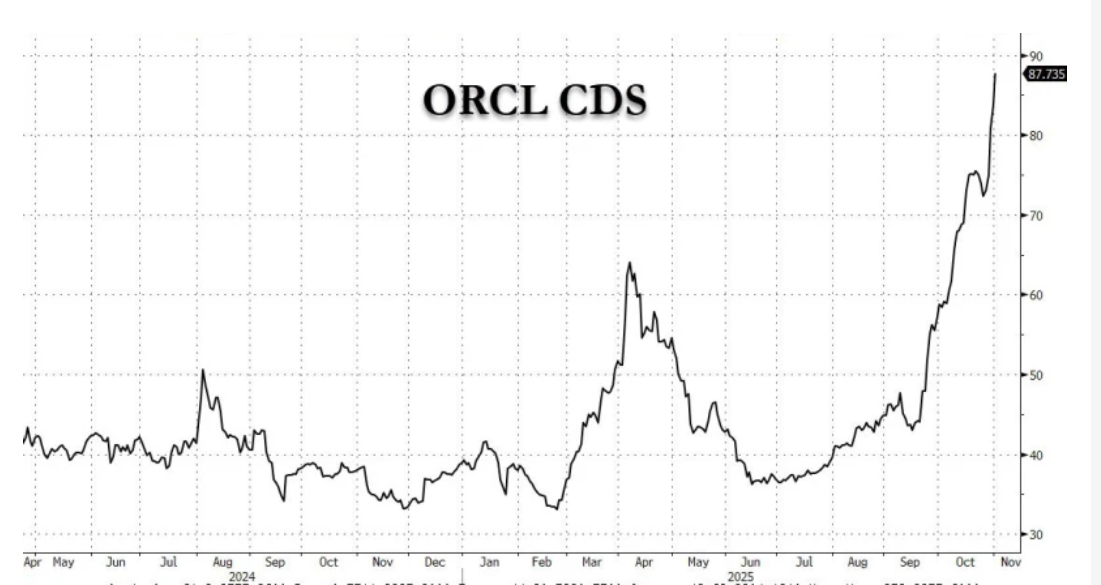 与此同时,信贷市场对甲骨文公司发出了越来越尖锐的警报声:甲骨文的信用违约互换(CDS)已升至87.7个基点——这是近18个月以来的最高水平。