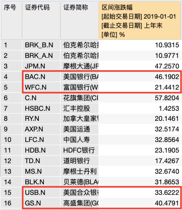 2019年美股长牛,大部分金融股也有不错的表现。巴菲特减持的美国银行去年年涨幅46%,高盛年涨幅40%,美国合众银行年涨幅近34%,富国银行年涨幅21%。