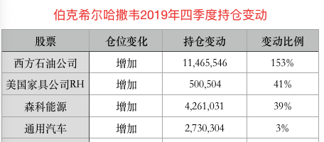 2019年四季度,巴菲特加大了对能源股和零售股的投资,前一个季度刚刚建仓的西方石油公司和美国家居公司RH继续被增持。