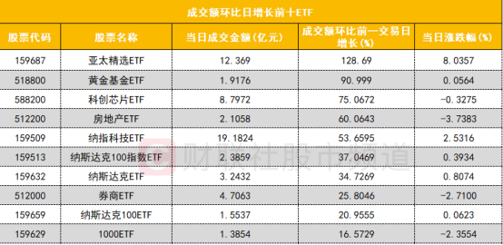 从成交额环比增长前十的ETF来看,亚太精选ETF(159687)成交额环比上个交易日增长128%位居首位;黄金基金ETF(518880)成交额环比增长90%位居第二位;四只纳指ETF位居前十行列。