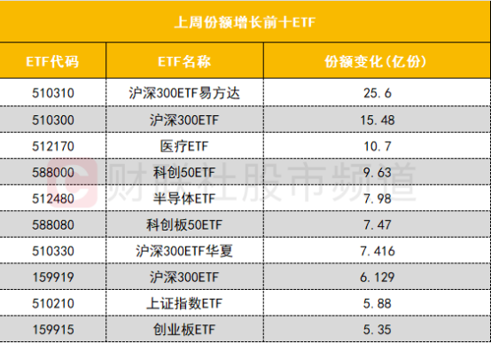 ②上周份额增长前十的ETF中,4只沪深300ETF在列,其中沪深300ETF易方达(510310)上周份额增长25.6亿份。