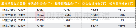 四大期指主力合约多空双方均减仓,IH、IF、IM合约均空头减仓数量较多;IC合约多头减仓数量略多。
