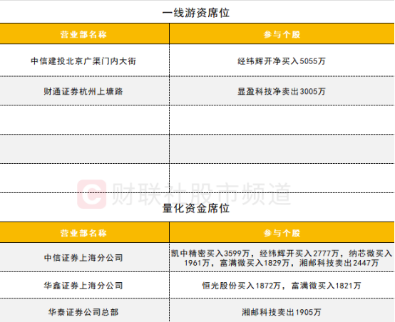 量化资金活跃度逆势提升,其中中信证券上海分公司营业部买入凯中精密、经纬辉开、纳芯微等多只个股。