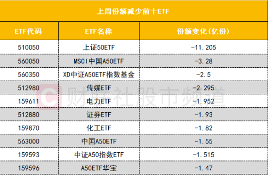 从上周份额减少前十的ETF来看,5只A50相关ETF位列其中,上证50ETF(510050)上周份额减少11.205亿份位居首位。