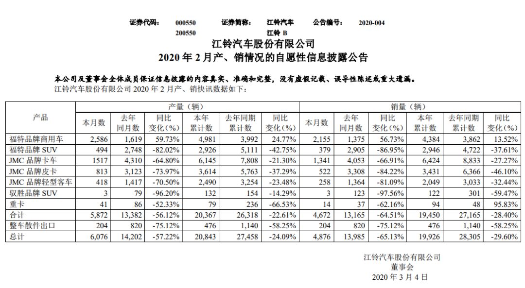 当晚江铃汽车(000550)发布的2020年2月汽车产销数据也显示,当月公司各车型产量共计6076辆,同比下滑57.22%;当月销量共计4876辆,同比下滑65.13%。