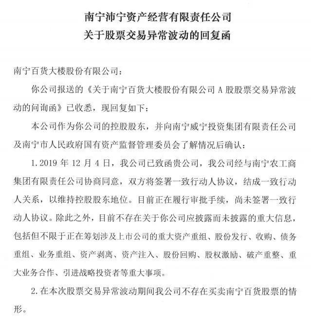 12月4日晚,南宁沛宁公告表示,将与南宁农工商集团有限责任公司(简称“南宁农工商”,持有南宁百货2.94%的股份)签署一致行动人协议,结成一致行动人关系,以维持控股股东地位。