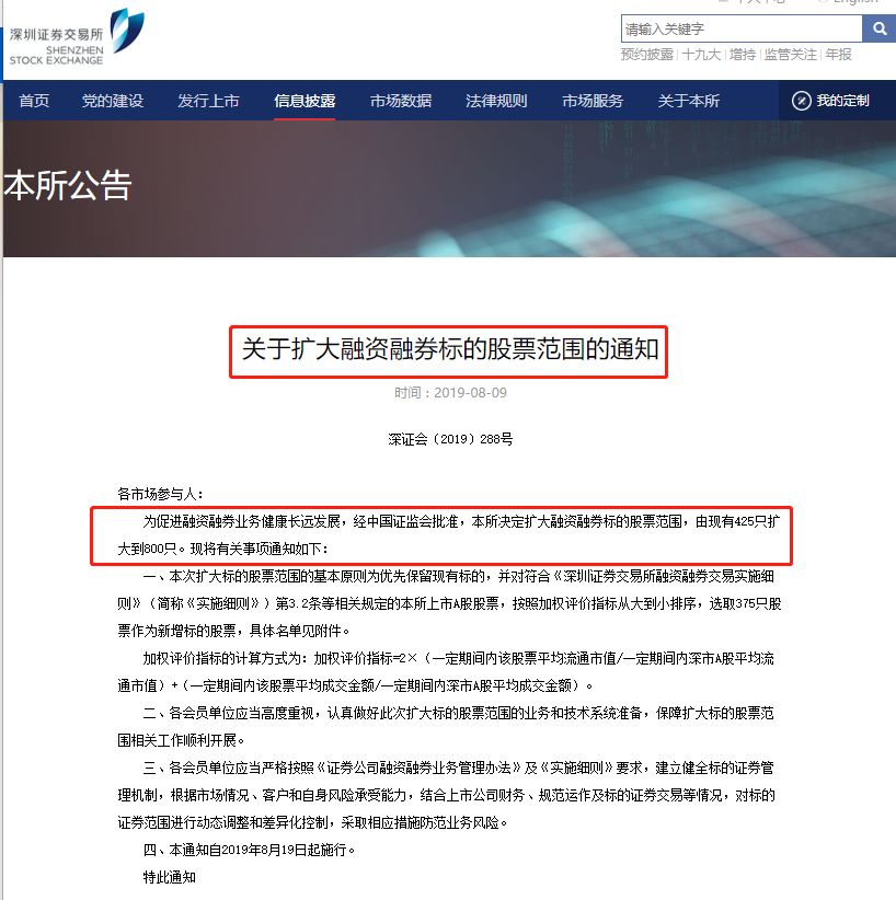 深交所同日也发布《关于扩大融资融券标的股票范围的通知》,为促进融资融券业务健康长远发展,经中国证监会批准,深交所决定扩大融资融券标的股票范围,由现有425只扩大到800只。