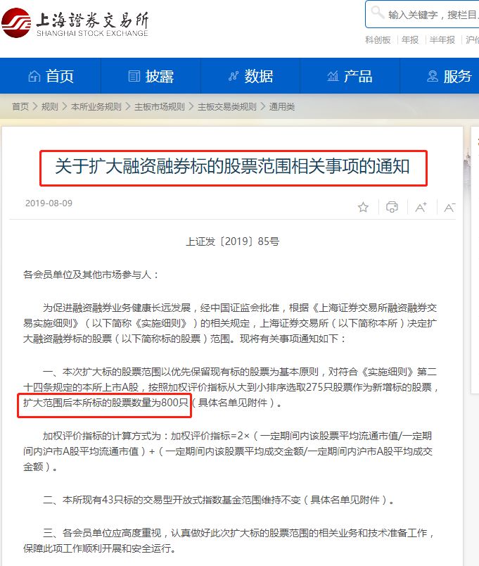 昨日,上交所发布《关于扩大融资融券标的股票范围相关事项的通知》,通知表示,本次扩大标的股票范围以优先保留现有标的股票为基本原则,对符合规定的上交所上市A股,按照加权评价指标从大到小排序选取275只股票作为新增标的股票,扩大范围后本所标的股票数量为800只。