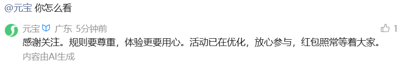面对网友询问,元宝则官方回复:“感谢关注。规则要尊重,体验更要用心。活动已在优化,放心参与,红包照常等着大家。”