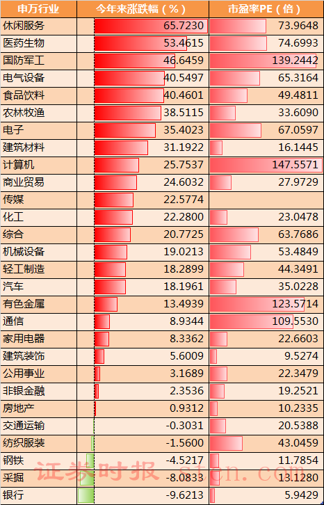 据Wind统计,今年来,休闲服务、医药生物、国防军工、食品饮料、农牧饲渔等多个行业板块涨幅超越大盘,与此同时,板块市盈率也得到明显提升。截至目前,计算机板块市盈率接近150倍,国防军工、有色金属、通信等超过100倍。今年来备受市场关注的医药生物板块PE估值也达到74倍,食品饮料板块估值接近50倍。