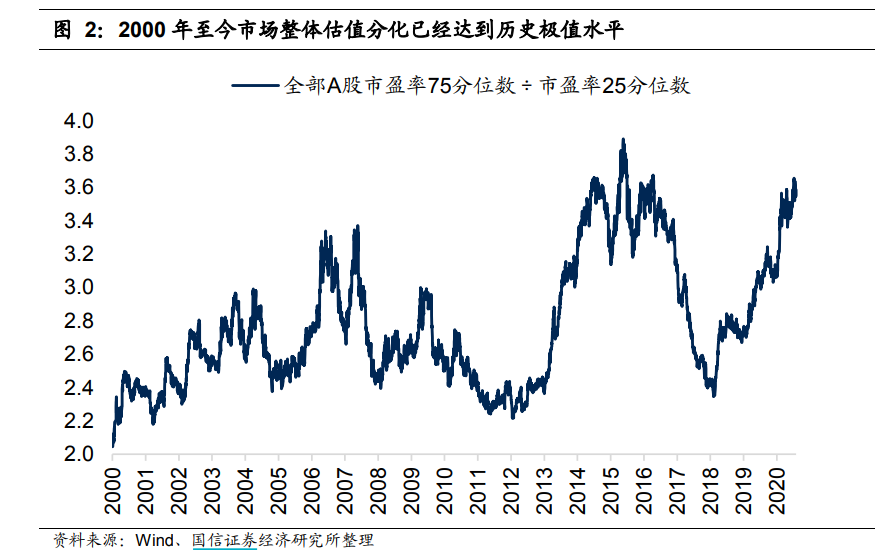 国信证券分析指出,当前市场整体的估值分化行情已经演绎到了极致,在这种极端行情下短期内市场出现估值收敛的可能性较大,主要原因有以下两点: