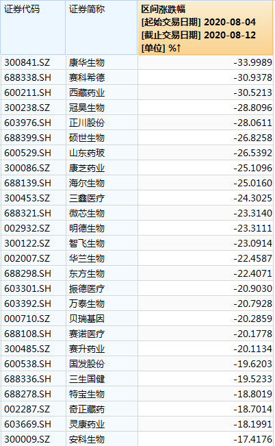 从近几日行情来看,目前,A股估值分化正在收敛。今年以来受资金持续追捧的医药、消费等板块,近期跌幅比较明显,尤其是医药生物板块,自8月初以来持续下跌。Wind数据显示,自8月4日以来,医药生物板块内不少个股跌幅超过20%,其中,康华生物、西藏药业等跌逾30%,科创板新上市的医药股赛科希德也持续下挫,正川股份、山东药玻、智飞生物、华兰生物、万泰生物等多个人气热门股跌逾20%。