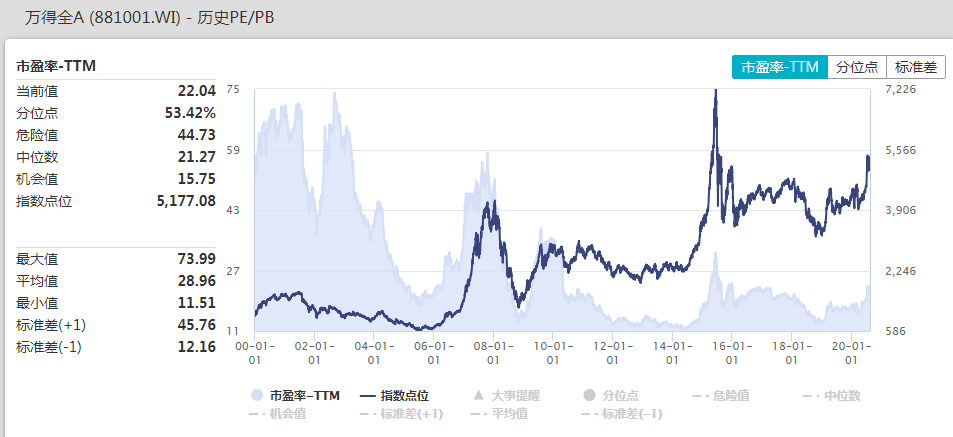 整体来看,目前A股市场估值水平并不高。Wind数据显示,虽然指数近期明显攀升,逼近5500点,但万得全A市盈率(TTM)仅为22.04倍,仍处于历史低位。
