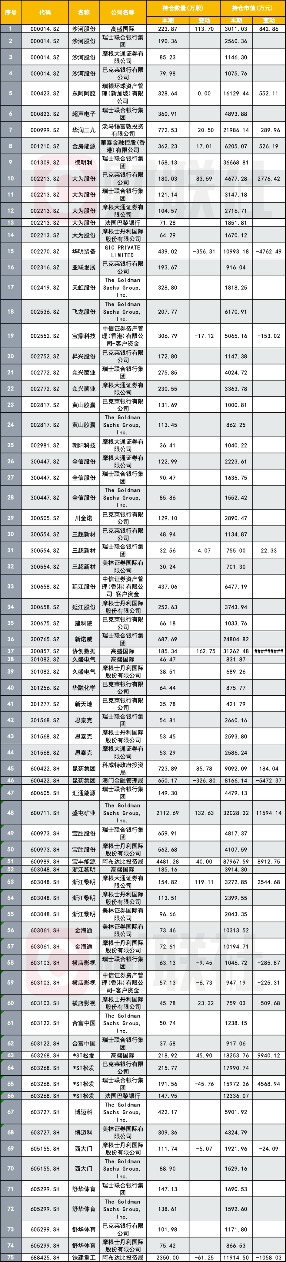 先看加仓方向,阿布达比投资局继续加仓宝丰能源,截至去年年末持股4481.28万股,较上期增加40万股,期末持仓市值达到8.80亿元,高盛国际加仓沙河股份113.70万股,加仓*ST松发45.90万股,The Goldman Sachs Group增持盛屯矿业132.63万股,摩根大通则加仓浙江黎明119.11万股。昆药集团也出现增持案例,科威特政府投资局持股590.68万股,较上期增加85.78万股。