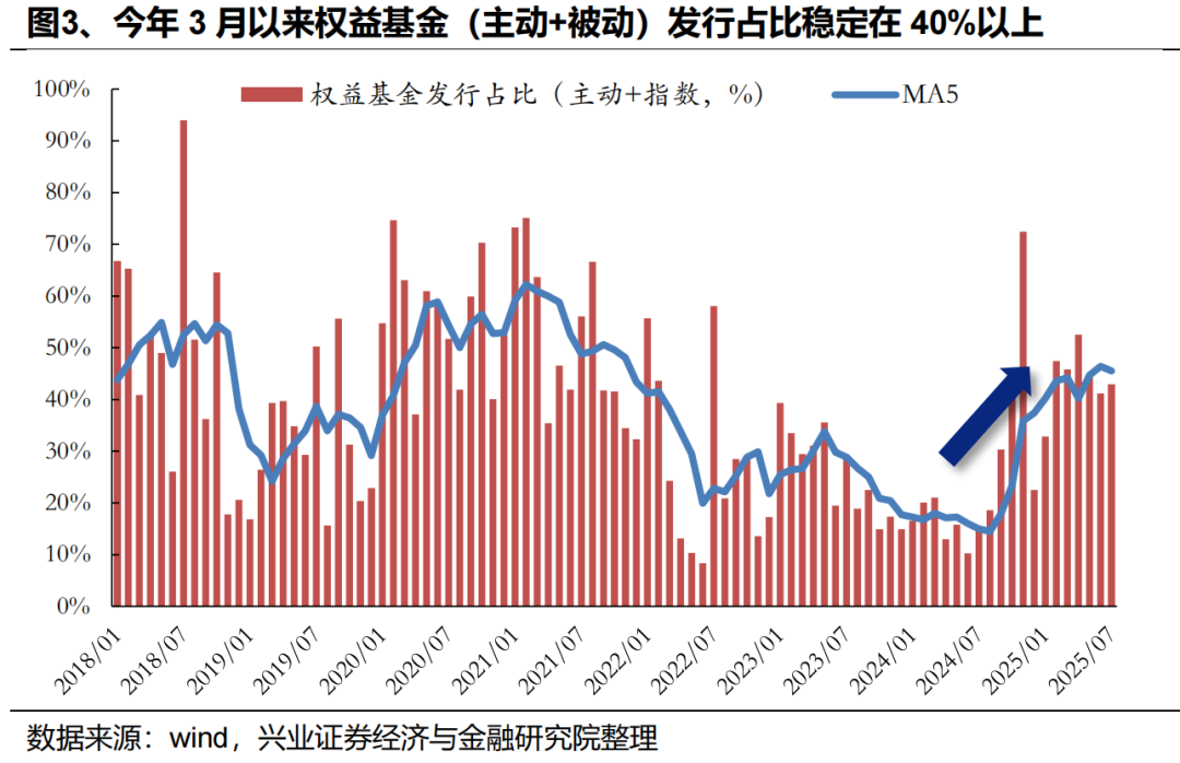 主动超额回归叠加市场赚钱效应显著,7月主动权益基金在新发与申赎两方面均有所边际改善,资金端的负循环低谷期或已悄然走出。6月份新发规模296亿元,为主动权益近年最大单月发行规模,而其中首批浮动管理费产品227亿元为主要贡献,传统费率产品新发70亿元。7月份主动权益权益基金新发规模97亿元,与对等关税冲击前的3月份发行规模接近。从传统费率产品角度看,月均发行规模已回升稳定至100亿元左右,此外近期第二批浮动管理费产品也已经逐步开启募集,有望驱动主动权益基金新发进一步向上改善。