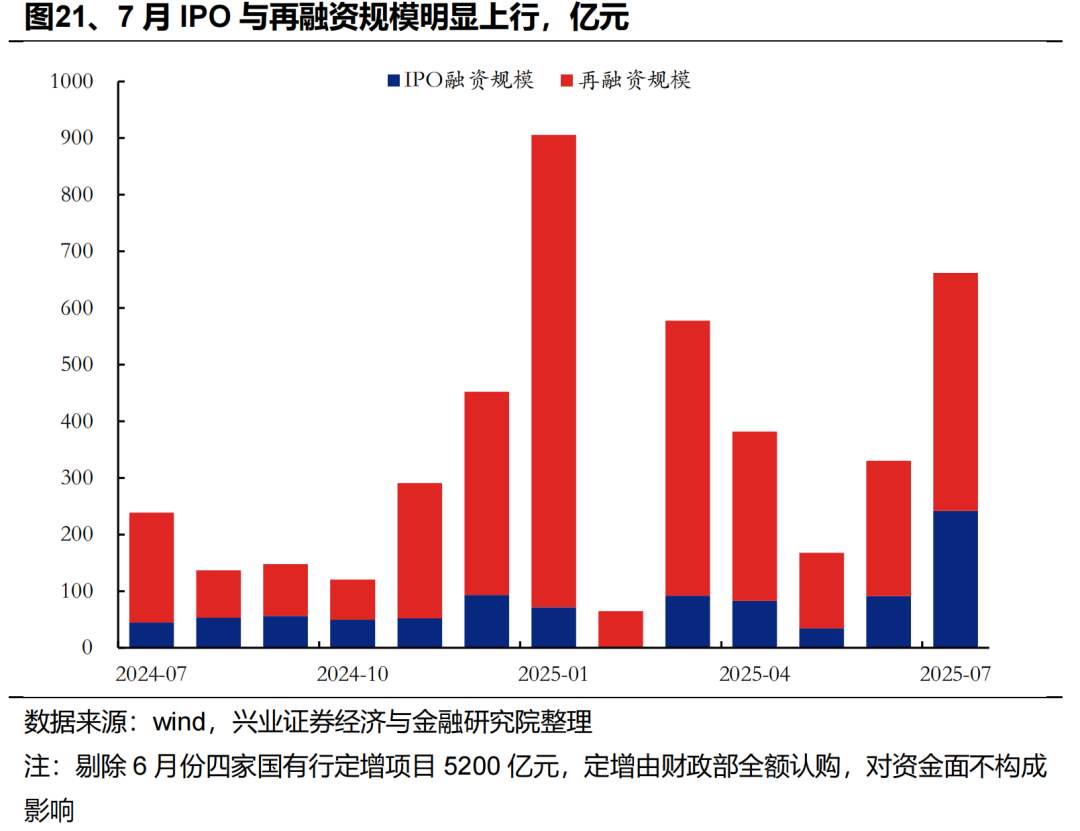 融资端来看,7月IPO与再融资规模均有较为明显上行,但仍处于极低水平。增量资金源源不断叠加融资需求有限,或是驱动市场交投情绪回暖、指数估值持续修复的重要因素。