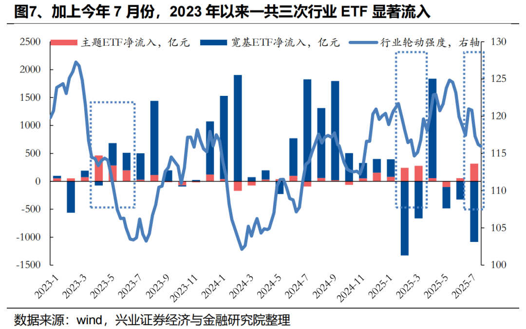 2023年以来,行业ETF显著净流入大致对应市场活跃度改善,同时市场主线共识初步形成,行业轮动强度处于阶段性回落,而ETF的净流入进一步强化并加速了共识的形成。2023年以来出现三次行业ETF显著流入, 2023年4月至5月围绕消费医药与TMT,2025年2月至3月围绕TMT与金融地产,7月以来市场共识聚焦于“低位周期修复”与“科技产业趋势”两条主线。