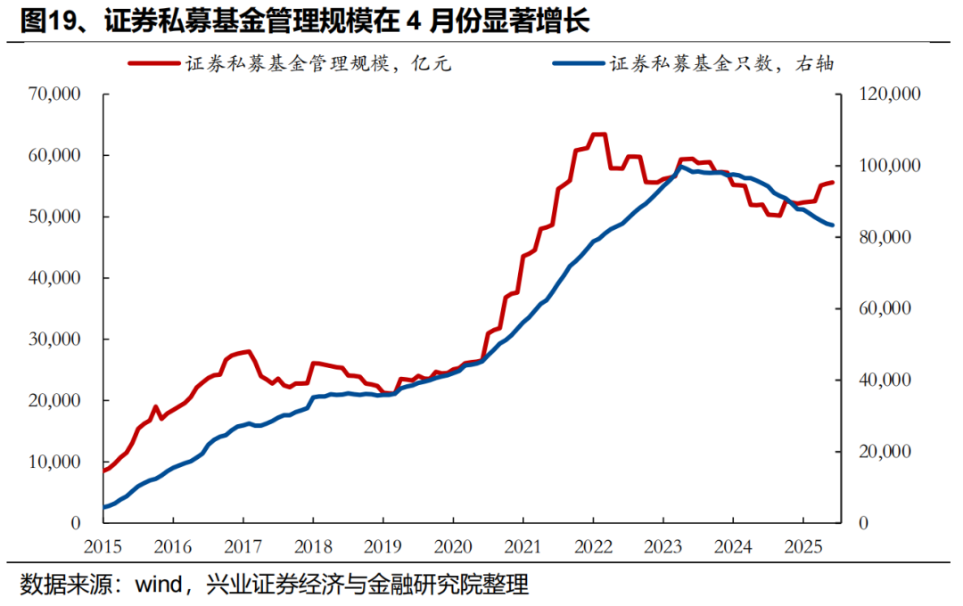7月私募仓位进一步上行,突破2024年以来仓位箱体上沿,与此同时,私募基金管理规模今年以来已增长3458亿元,私募仓位与管理规模同步上行,指向私募多头同样是本轮市场上行的重要边际增量资金。根据华润信托数据,6月股票多头私募仓位环比上升3.3pct至61.1%,突破从去年9月底以来处于55%至58%的窄幅区间,若后续回升至2022至2023年上半年65%左右的中等水平,或2020至2021年的75%左右的高仓位水平,有望带来大量新增资金。与此同时,截至6月底,证券私募基金管理规模55588亿元,环比5月增长191亿元,较年初增长3458亿元。