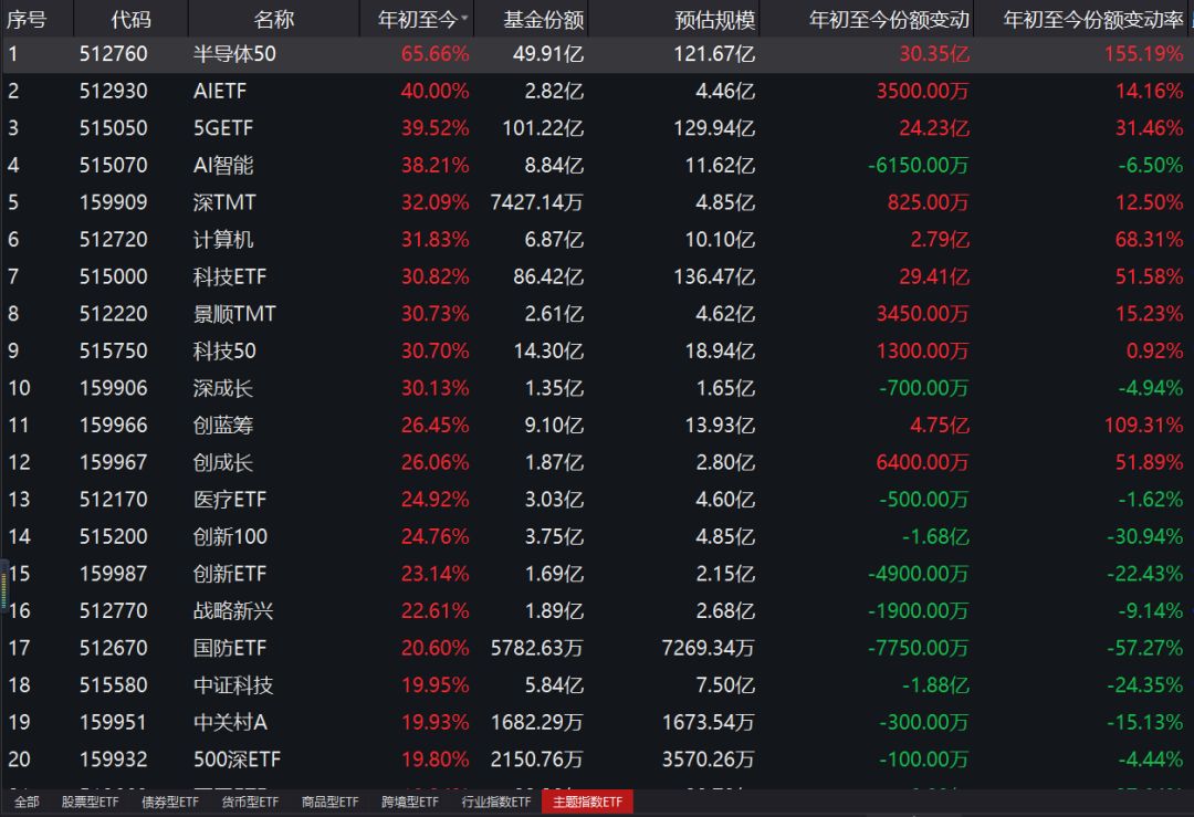 数据显示,年初至今涨幅居前的主题指数ETF大多数为科技类别,5G、半导体、AI、计算机等多个细分领域均包括在内。