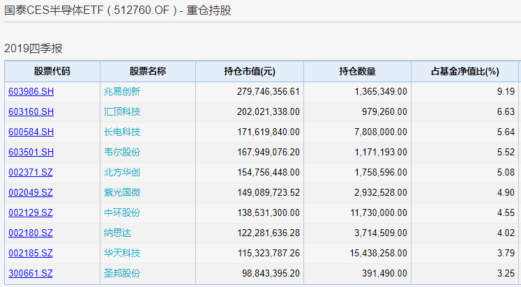 从基金份额上来看,半导体50ETF年初至今基金份额从19.6亿上涨至49.9亿,扩张幅度达155.19%;从流动性上,该ETF近5日资金均实现净流入,合计流入超22亿元。在如此火爆行情的助推之下,目前半导体50ETF的市盈率高达175.46倍,市净率为8.99倍。截至2019年四季报,其重仓持股明细如下: