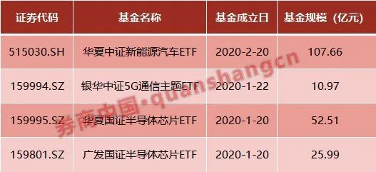 其中,华宝中证科技龙头ETF成全市场最大科技ETF,规模达136亿;国泰CES半导体ETF为目前最牛ETF,年初至今累计涨幅65.66%,基金份额扩张超150%;2月20日正式成立的华夏中证新能源汽车ETF成为首只发行规模超百亿的行业ETF,18.5万户认购总规模107.6亿元。