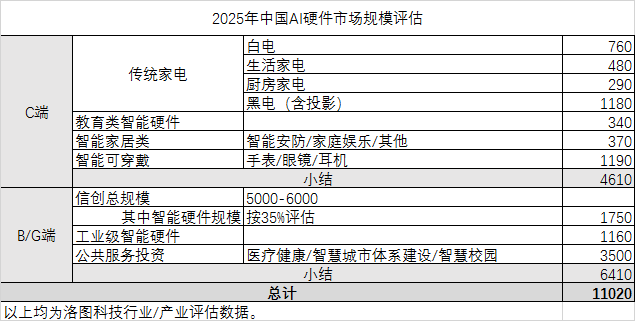 在国内AI消费电子硬件市场中,手表、眼镜和耳机的智能穿戴市场,以及彩电和投影组成的黑电市场,今年均超千亿元,分别将达1190亿元和1180亿元;白电、生活家电、厨房家电市场今年分别将达760亿元、480亿元和290亿元;教育类智能硬件、智能家居类硬件(智能安防、家庭娱乐等)市场分别将达340亿元和370亿元。