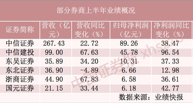 净利润方面,6家上市券商上半年同比均实现正增长。其中,中信证券上半年实现净利润89.26亿元,同比增长38.47%;中信建投上半年实现净利润45.78亿元,同比增长96.54%;东吴证券上半年净利润为10.31亿元,东北证券、浙商证券、国元证券上半年净利润均超6亿元。