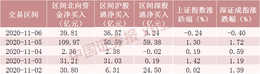 本周北向资金净流入超210亿元,连续5个交易日净流入。具体来看,Choice数据显示,11月2日北向资金净流入30.80亿元,11月3日净流入31.21亿元,11月4日净流入2.36亿元,11月5日净流入109.97亿元,11月6日净流入39.81亿元。