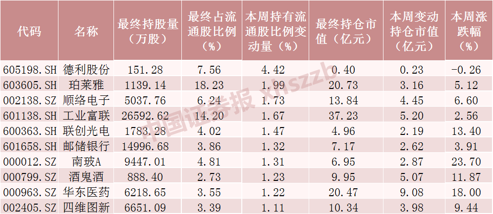 从持有流通股比例情况来看,Choice数据显示,本周北向资金对14只个股的持有流通股比例增加1%以上,其中对德利股份持有流通股比例增加4.42%,对珀莱雅、顺络电子、工业富联的持有流通股比例增加超1.5%,分别增加1.99%、1.73%、1.67%。