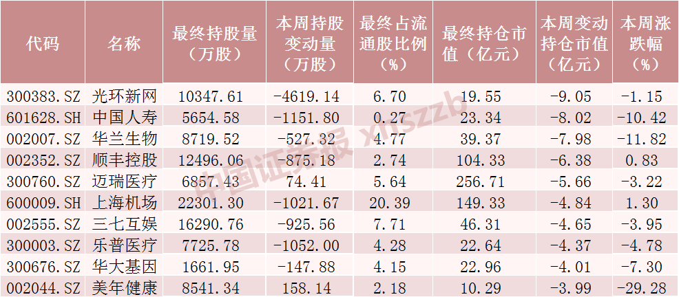 从持仓市值变动情况来看,Choice数据显示,本周北向资金仅对5只个股的持仓市值减少超过5亿元,分别为光环新网、中国人寿、华兰生物、顺丰控股、迈瑞医疗,持仓市值分别减少9.05亿元、8.02亿元、7.98亿元、6.38亿元、5.66亿元。从市场表现上来看,本周北向资金持仓市值减少额超5亿的个股除顺丰控股上涨0.83%外,其他4只个股均下跌,华兰生物跌幅最大,本周累计下跌11.82%。