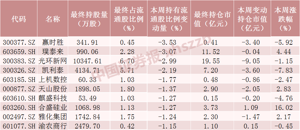 从持有流通股比例情况来看,Choice数据显示,本周北向资金对15只个股的持有流通股比例减少1%以上,对赢时胜、璞泰来、光环新网的持有流通股比例减少居前,分别减少3.53%、3.07%、2.99%。从市场表现上来看,北向资金持有流通股比例减少居前十的个股涨跌参半,跌幅最大的凯利泰本周下跌7.83%,涨幅最大的合盛硅业本周上涨16.02%。