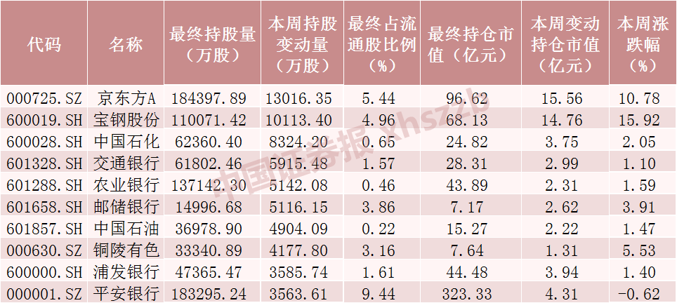 Choice数据显示,截至11月6日,北向资金持仓市值为2.06万亿元,本周北向资金持仓市值增加1110亿元。本周北向资金共计加仓859只个股。本周北向资金对77只个股的加仓股数超过1000万股,加仓股数最多的京东方A被加仓1.30亿股,此外分别加仓宝钢股份、中国石化1.01亿股、0.83亿股,同时对交通银行、农业银行、邮储银行加仓超5000万股。在北向资金加仓股数前十的个股中,银行股占一半,反映了本周北向资金对银行股的显著加仓。