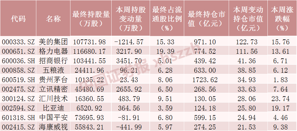 从持仓市值变动情况来看,Choice数据显示,本周北向资金对46只个股的持仓市值增加超过5亿元,对美的集团、格力电器、招商银行持仓市值增加金额居前,持仓市值分别增加122.73亿元、111.56亿元、41.36亿元。在本周北向资金持仓市值增加额居前十的个股中,仅有美的集团、中国平安、海康威视被北向资金减仓,格力电器、招商银行、五粮液等白马股被加仓。