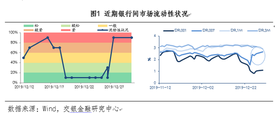 从时点上考虑,跨年时间节点,现金需求、考核、银行报表时点等多重因素都使得岁末年初市场流动性压力比较大。尽管自2019年12月18日起,央行重启逆回购并连续投放了6000亿14天跨年资金以确保市场平稳跨年,银行间市场流动性压力监测指数IBLI还是显示节前最后两个交易日市场流动性压力依然快速回升。虽然DR1M与DR3M仍稍有回落,但DR007利率节前明显反弹。这也直接表明市场对于未来的货币政策以及流动性整体预期是乐观的,但短期年节时点上仍需要一定的流动性进行过渡,进而导致市场上短期资金成本快速反弹。并且2019年12月下旬投放的14天逆回购资金节后即将到期,到期压力可能给市场带来短期的波动,为对冲到期压力,同时应对春节临近市场流动性需求的压力,央行也有预调投放流动性的必要。