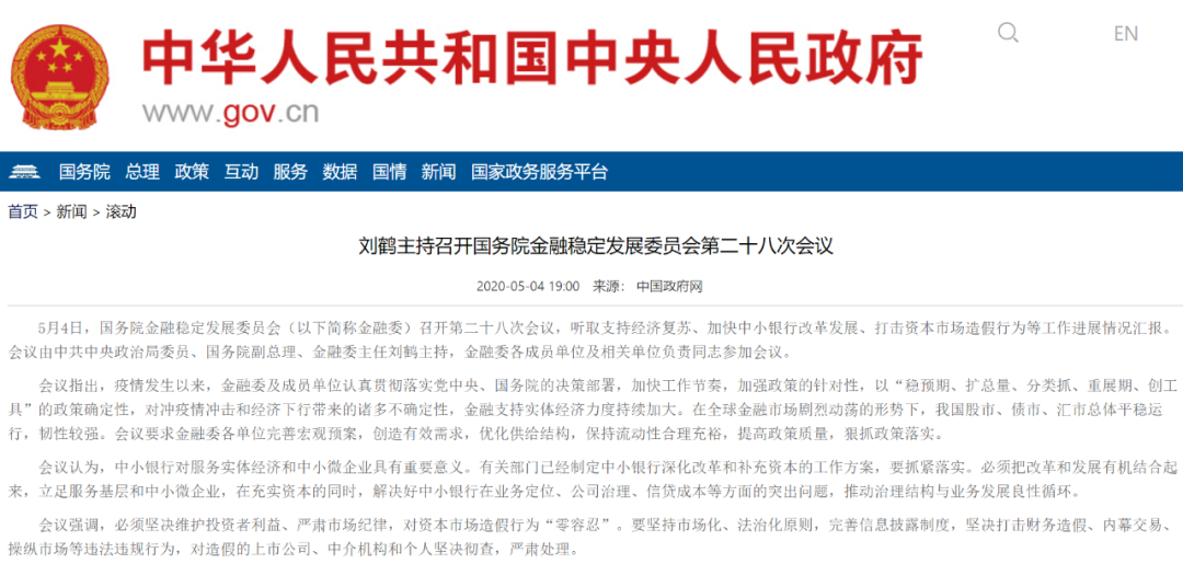 5月4日,国务院金融稳定发展委员会(以下简称金融委)召开第二十八次会议,听取支持经济复苏、加快中小银行改革发展、打击资本市场造假行为等工作进展情况汇报。会议由中共中央政治局委员、国务院副总理、金融委主任刘鹤主持,金融委各成员单位及相关单位负责同志参加会议。