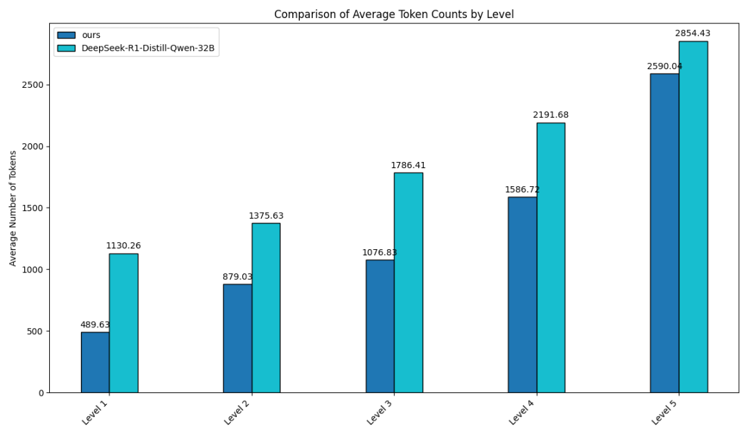 中国联通以DeepSeek-R1-distill-32B模型为例,对上述方法的效果进行了验证。通过在数学任务测评集(MATH500)上对比以及具体实验可以看到,经过难度自适应改造后的模型在不同难度等级问题上生成的回答长度较原版均明显下降,并且对于最高难度(Level 5)输出的回答长度降幅最大,体现了模型对不同难度等级问题具备自适应慢思考能力。经过测评,这种创新的自适应慢思考方法,平均可节省约30%的推理计算量,冗余输出大幅减少,用户体验得到有效提升。