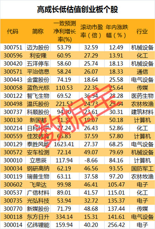 22只高成长创业板个股估值仍较低