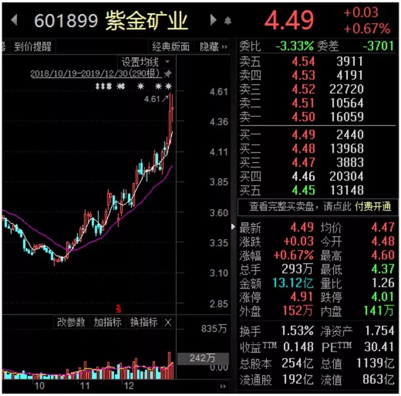 12月30日,紫金矿业再度上涨0.67%,股价报收4.49元,市值达到1139亿元,从10月下旬至今,股价已经上涨了40%左右。