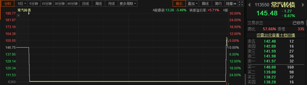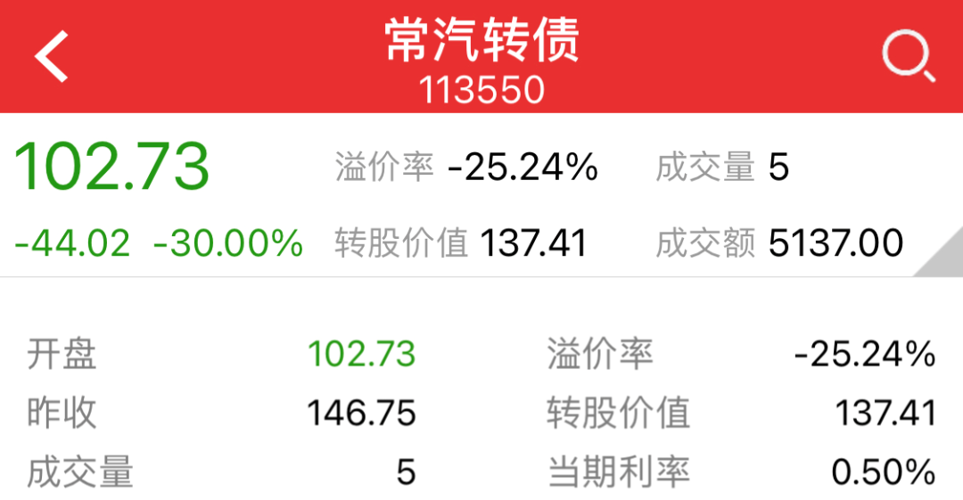 早间开盘时将常汽转债砸至“熔断”的,是成交额仅为5手共计5137元的一笔交易。从前一日的交易数据可见,常汽转债昨收146.75元,今日开盘时102.73的成交价使转股溢价率从昨日的2.92%骤降至-25%。