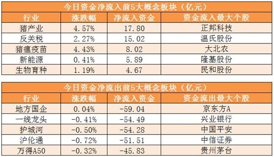 概念板块方面,今日猪产业、反关税、猪瘟疫苗等概念板块资金呈现净流入,其中猪产业概念净流入17.8亿元居首。