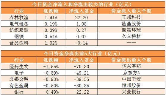 28个申万一级行业中,4个行业实现资金净流入,其中农林牧渔行业净流入22.2亿元居首。
